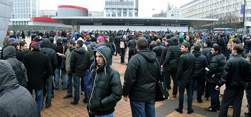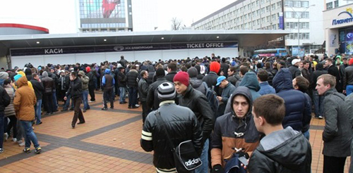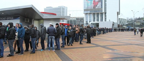 Возле НСК «Олимпийский» уже второй день огромные очереди из желающих забрать купленный в интернете билет, а также достать билет из небольшого количества «выброшенных» на продажу через кассы. Люди в очередях нервничают, иногда дерутся. Милиция стоит рядом и не предпринимает никаких попыток организовать толпу.