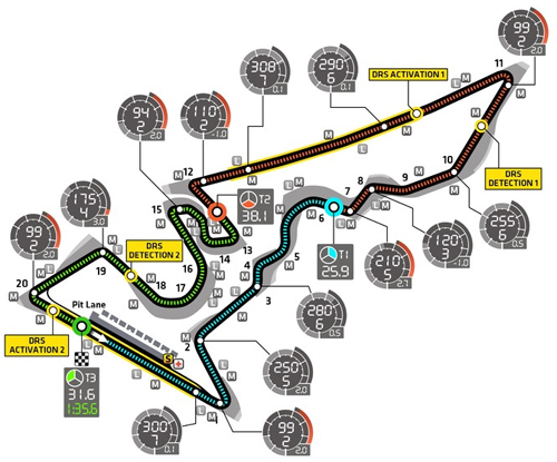 Для чемпіонату головним є його достойне та по-справжньому цікаве завершення, а самі очікування від американського уїк-енду досить різні. З одного боку є фактор Red Bull, з яким у паддоку змирилися, здається, всі, крім Хемілтона з Грожаном. З іншого – ми маємо вкрай цікаву трасу, на якій за сприятливих для вболівальників умов можна очікувати на інтригу. Що не кажіть, але після кризи ідей та клонованих, ніби овечка Доллі, автодромів, у герра Тільке вийшов хоч і не шедевр, та цілком пристойний і неординарний автодром, який покликаний стати справжнім домом для Формули 1, а не її тимчасовим прихистком, яким були Індіанаполіс, Уоткінс-Глен, Лонг-Біч та інші траси. Хоча поєднанням швидкісних секцій з повільними та прямими ми бачимо ледве не під час більшої частини етапів, та досить різкий перепад висот і сліпі повороти (особливо перший) привносять особливий шарм цій сучасній трасі.