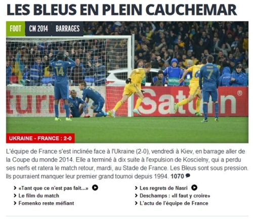 «Опять с нашей сборной случилась катастрофа сродни тем, что преследуют ее в последние годы. Судя по тому, что показала сборная Франции в Киеве, а до этого, будем справедливы, и на Евро-2012 в матче со шведами, «трехцветные» не заслуживают путевки на ЧМ-2014. С французской национальной командой каждый раз происходит одно и то же – перед самыми ответственными поединками стремление и умение преодолевать трудности у ее футболистов куда-то испаряются».