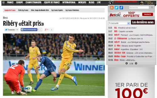 «Рибери поймали в тиски. Ему всегда оставляли слишком мало пространства, чтоб он мог показать свои лучшие качества. Вокруг него всегда вырастали защитники, которые его очень плотно опекали. Украинская сборная, разумеется, осознавала опасность, которую он представляет, поэтому они приложили много сил для его нейтрализации. Против него было совершено много агрессивных действий и много фолов, не все из которых были наказаны арбитром».