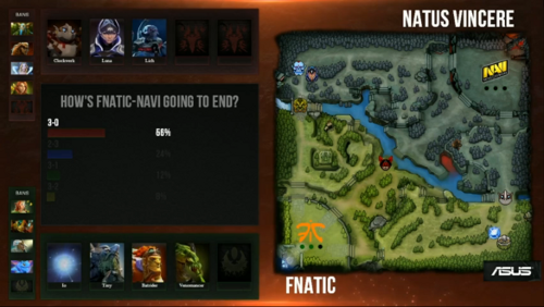 На 29-ой минуте Tiny уже начинает царапать последнюю верхнюю вышку. Его прикрывают Wisp и Batrider, которые ожидают того, кто первый придет на защиту. Тем временем Na`Vi пушат линию. Fnatic внезапно отдают третью вышку, но тут возвращаются Tiny и Wisp и делают тимвайп Na`Vi. Контратака от "Фанатиков" и тройной Rampage от Era отправляет украинскую команду в нижнюю сетку турнира.