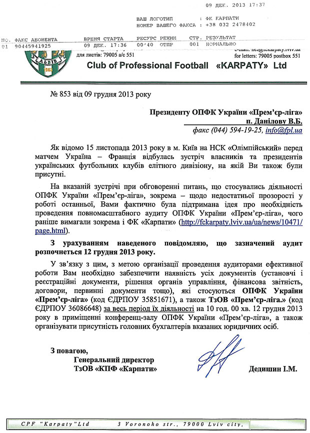 У зв’язку із цим, з метою організації проведення аудиторами ефективної роботи, львівський клуб наполягав на забезпеченні наявності усіх документів (установчі і реєстраційні документи, рішення органів управління, фінансова звітність, договори, первинні документи тощо), які стосуються ОПФКУ «Прем’єр-ліга», а також ТзОВ «Прем’єр-ліга» за весь період їх діяльності на 10:00 12-го грудня 2013 року в приміщенні конференц-залу ОПФКУ «Прем’єр-ліга», а також організувати присутність головних бухгалтерів вказаних юридичних осіб (скан-копія листа – нижче).