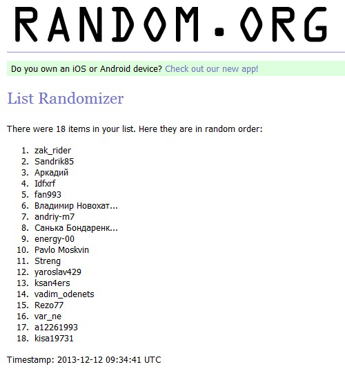 18 человек угадало все восемь команд, которые вышли в плей-офф Лиги чемпионов. Для определения победителей мы провели жеребьевку с помощью сервиса Random, который и отсортировал участников в таком порядке: