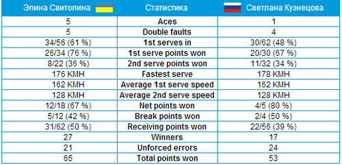 19-летняя харьковчанка выбила 19-ю ракетку турнира, одержав победу в двух сетах – 6:3, 6:3. За матч украинка сделала пять подач на вылет и пять двойных ошибок, у Кузнецовой же один эйс и четыре двойных ошибки.