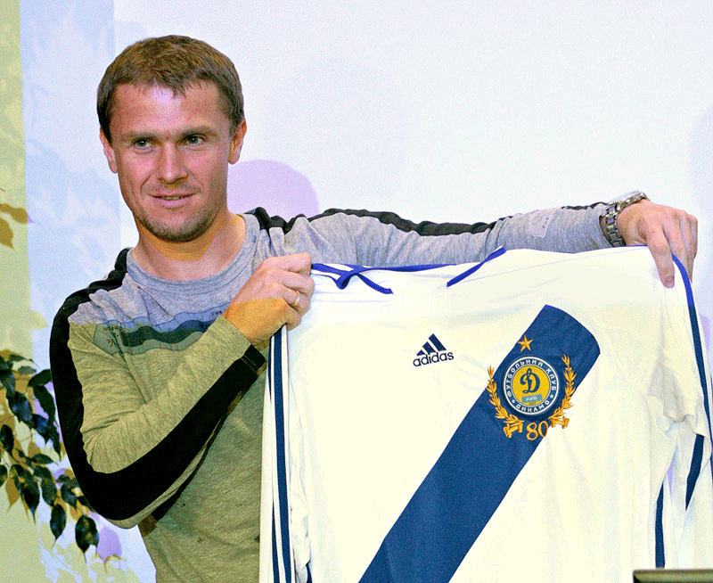 капитан команды Сергей Ребров презентовал общественности бело-синюю футболку с новой, юбилейной, динамовской эмблемой.
