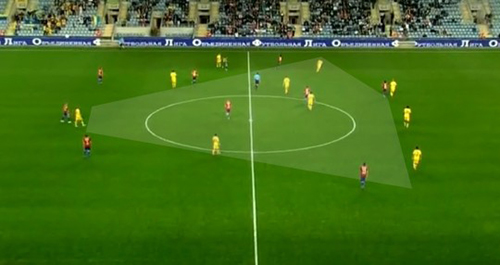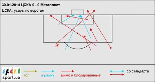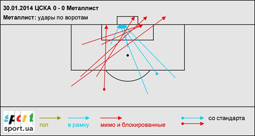 Обе команды были агрессивны в прессинге на половине поля соперника. Компактная игра, присущая как ЦСКА, так и «Металлисту», лучше использовалась харьковчанами при переходе из обороны в атаку. Близко взаимодействующие группы их игроков быстро заполняли свободное пространство, например на фланге. При переходе атаки в затяжную фазу команда быстро перестраивалась для образования широкого фронта и поиска уязвимых «дыр» в обороне ЦСКА. Явное преимущество в игровой инициативе в первом тайме, а по итогам игры – в острых моментах и ударах (см. таблицу ниже) – неоспоримо это доказывает.