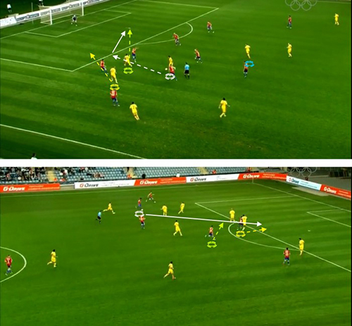 Соуза (вверху) и Витиньо (внизу) – белые выполняют ведение мяча и проникающие передачи на забегающих в зону штрафной дуги партнеров (желтые и зеленые)