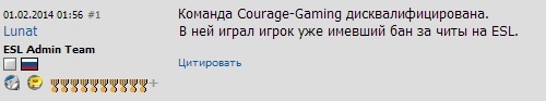 Причиной столь резкого решения стала игра за коллектив забаненного несколько лет назад на ESL пользователя, который зарегистрировался под новым аккаунтом. При этом точное имя виновника дисквалификации не сообщается.