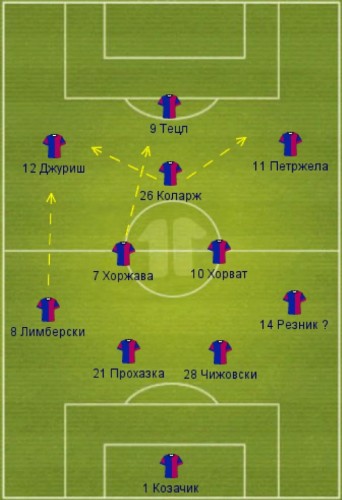 Передачи Хорвата вперед наиболее часто адресованы Коларжу и форварду Тецлу. Занимающий позицию под нападающим Коларж, является второй ключевой креативной фигурой, составляющей центральную ось в построениях «Виктории». Это своего рода аналогичный по функциям Хорвату игрок – плеймейкер «верхнего уровня». В его обязанности входит организация игры на завершении. Типовые направления атак «Виктории» приведены на схеме. Пунктиром обозначены смещения игроков, стрелками – наиболее часто выполняемые передачи. Представлены основные направления развития атак из глубины и фланговые акценты в передачах на завершении.