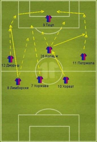 При выполнении передачи Хорватом происходит не только передача мяча в адрес игроков атакующей линии. Весьма характерным выглядит и то, что параллельно мячу в атаку устремляется Хоржава. И это вполне объяснимо – 38-летний Хорват все еще обладает отличным нацеленным пасом, но для путешествий в стиле «бокс – ту бокс» уже староват. Поэтому вполне логичным выглядит то, что на стадии устойчивого владения мячом для поддержки атаки своим пасом Хорват «отправляет» вперед не только мяч, но и своего более молодого напарника по центру поля. То же самое происходит при выполнении передачи вперед самим Хоржавой. Ветеран Хорват при этом чаще всего остается в средней линии для страховки.