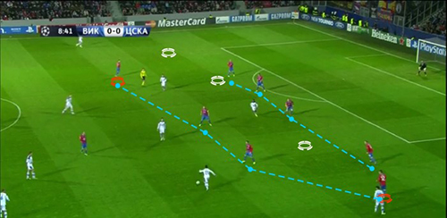 Стандартным вариантом в игре против команды, которую в атаке поддерживают фланговые защитники, является контратака в освобожденной ими зоне. У «Виктории» сюда не всегда успевает вернуться Лимберски, а Хорват и партнеры по обороне в силу невысоких скоростных качеств не всегда успевают это сделать. Даже не слишком массово атакующий ЦСКА получил ряд возможностей использовать такие провалы. Это является одним из уязвимых мест команды из Пльзеня. Расположивший в этой зоне Коста или другой атакующий игрок «горняков» может получить перспективную передачу на ход такого рода от Срны или, скажем, Ракицкого.