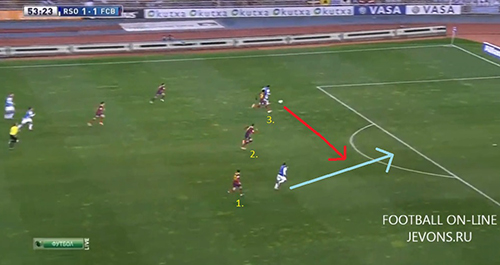 Гризманн (1) спокойно навешивал на набегающего Сурутусу (2). Только один футболист «Барселоны» (3) видел, что в штрафную площадь на огромной скорости врывается Сурутуса, но ничего с этим сделать не смог. Если не считать Иньесту, который стоял на одной линии с Гризманном и Пике, который не помешал французу сделать пас, то сразу пять игроков «Барсы» были в штрафной момент забития мяча.