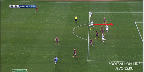 Карлос Вела делает передачу на ход Гризманну. Адриано (1), который должен был бы опекать француза, выключился из борьбы; Пике (2) стартовал одновременно с Гризманном и должен был не дать мячу дойти до Антуана, но испанский защитник проиграл в скорости игроку «Ла Реала»; Сонг (3) никак не помешал Веле сделать голевую передачу, хотя в этом эпизоде Алекс опекал мексиканца.