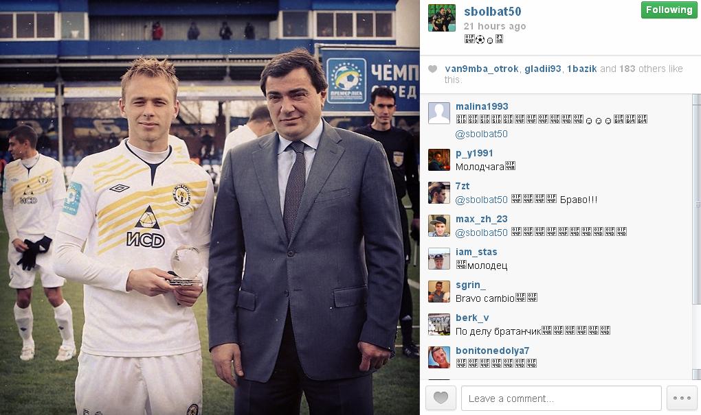 Полузащитник донецкого «Металлурга» Сергей Болбат получил награду Лучшему молодому игроку Украины по версии Sport.ua. Фото с награждения Болбат выложил в своем Instagram: