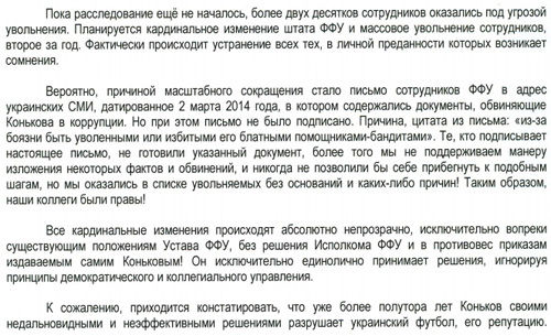 Глава ФФУ Анатолий Коньков подписал приказ об увольнении 40 сотрудников федерации. Официальная версия: сокращение штата. По мнению некоторых сотрудник президент избавляется от людей, которые конфликтуют с ним.