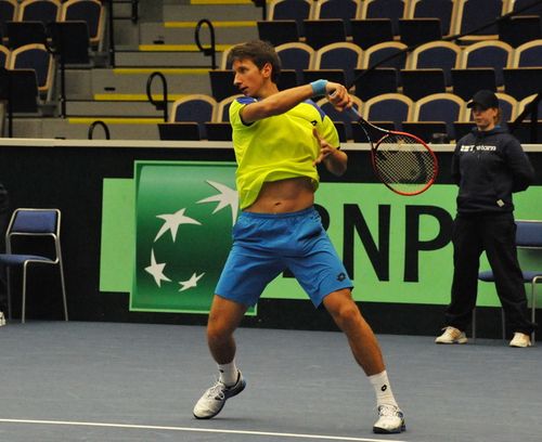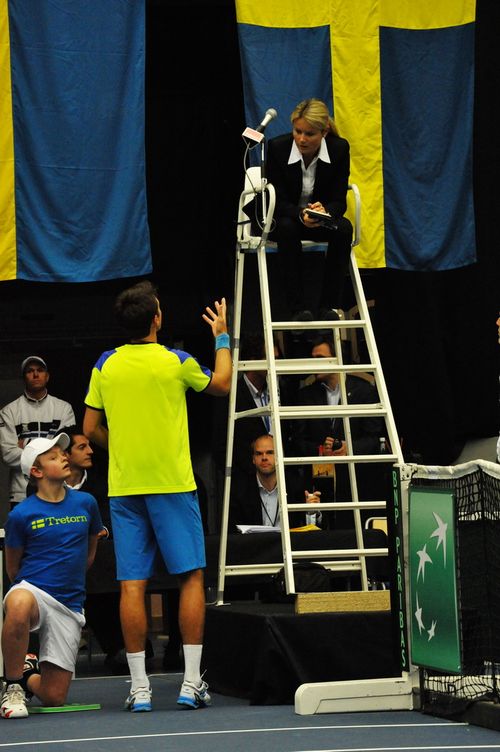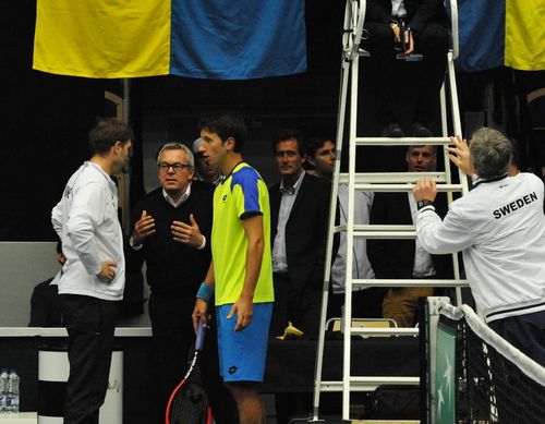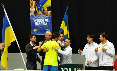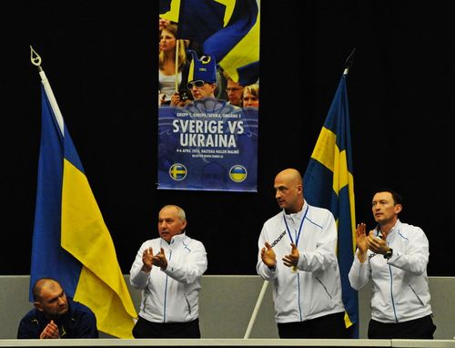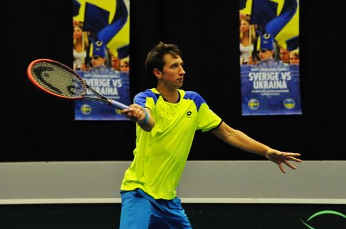 Сергей Стаховский вывел сборную Украины вперед в поединке с командой Швеции. Напряженный поединок длился более 4-х часов. Украинец довольно уверенно начал мачт против Йохана Брунстрема, выиграл два сета к ряду 6:4, 6:4. Но шведу , который на данный момент не имеет профессионального рейтинга в одиночном разряде, удалось переломить ход поединка, он сумел взять следующие 2 сета и перевести матч в решающую пятую партию.