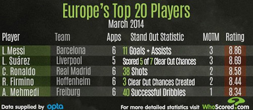 Влиятельный международный портал WhoScored подводя статистические итоги в топ-лигах Европы в марте в общем суммарном рейтинге на 5-ю место определил арендованного киевским «Динамо» немецкому «Фрайбургу» нападающего Адмира Мехмеди.