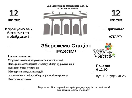 В связи с этим, общественная организация «Футбольный клуб «Старт» обращается ко всем болельщикам киевского «Динамо» с просьбой поддержать своими подписями заявление, по отводу земельного участка (Стадион «Старт») в собственность общественной организации «Футбольный клуб «Старт». Сбор подписей состоится 12 апреля в 11:00 на Стадионе «Старт» (г. Киев, ул. Шолуденко, 26-28/4). Заявление, обоснование и ведомость для подписей прилагаются ниже по ссылкам для скачивания.