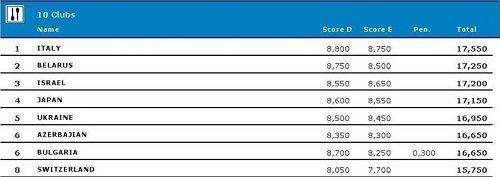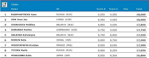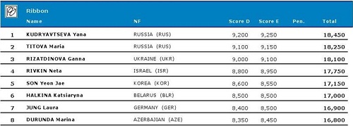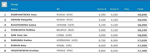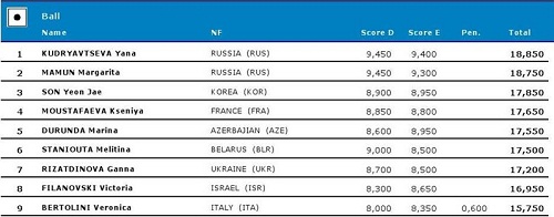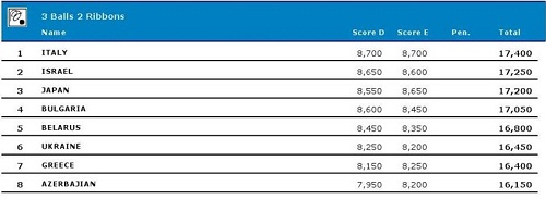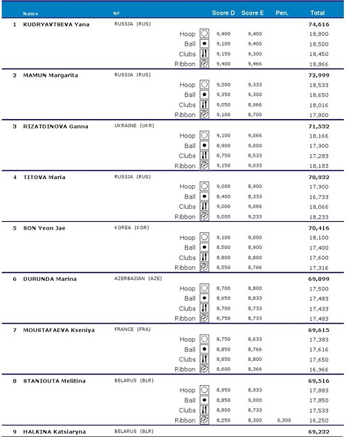 Все виды выиграла Яна Кудрявцева. Ее подруга по команде Маргарита Мамун стала трижды второй (многоборье, обруч, мяч). Еще одна россиянка – Мария Титова – возвращается домой с одной серебряной медалью за упражнение с лентой.