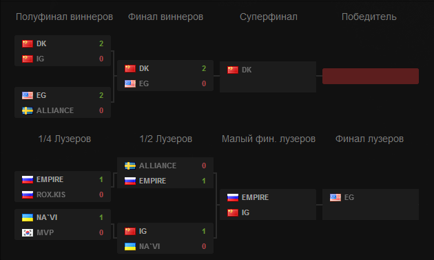 Natus Vincere, к сожалению, вылетают с турнира, занимая вместе с Alliance 5-6 место. Что касается iG, то завтра они сыграют против Empire в малом финале лузеров.