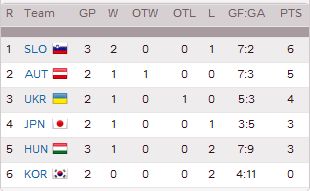 Сегодня наши хоккеисты проведут свой третий поединок на проходящем в южнокорейском Кояне чемпионате мира по хоккею І Дивизиона. Соперником будет сборная Страны восходящего солнца - Японии. Японцы в стартовой встрече турнира обыграли Словению, во второй уступили австрийцам и теперь отстают от сборной Украины на одно очко, так что победа сегодня нам просто необходима. К тому же словенцы сегодня уже обыграли сборную Венгрии - 2:0. Вот как выглядит таблица нашей группы: