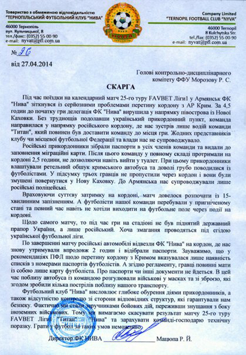 Футбольный клуб «Нива» направил жалобу в адрес Председателя контрольно-дисциплинарного комитета ФФУ Романа Морозова.