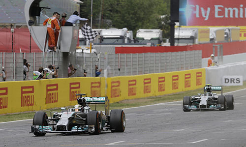 На чолі пелотону Хемілтон продовжував боротьбу з Росбергом, намагаючись таки відірватися на «замовлені» інженером 4 секунди перед візитом в бокси. Поступова втрата ефективності гуми та колові пілоти додавали інтриги цій боротьбі, адже Льюіс то відривався на 4,5 сек., то Ніко скорочував відстань до 3,7 сек. Проте перед самим піт-стопом британця секундомір зафіксував 4,2 секунди. Здавалося б цього має вистачити, але механіки «шаманили» над машиною Хемілтона 4,3 сек., що зіпсувало настрій Льюіса, який прекрасно розумів ціну кожної десятої. Його злість можна зрозуміти, адже за два кола Росберга обслужили рівно за 3 секунди, тож німець тільки там відіграв більше секунди. У Ніко було 21 коло на те, щоб наздогнати й обігнати напарника, тим паче, що тепер більш швидка гума стояла на машині німця. Велике іспанське переслідування з цієї миті заграло новими барвами!