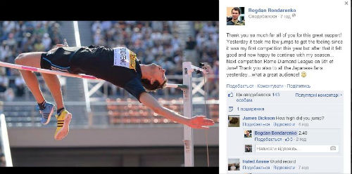 Украинский прыгун в высоту Богдан Бондаренко, который выиграл свой первый страт в сезоне в японском Токио, поблагодарил болельщиков за поддержку на своей странице в Facebook.