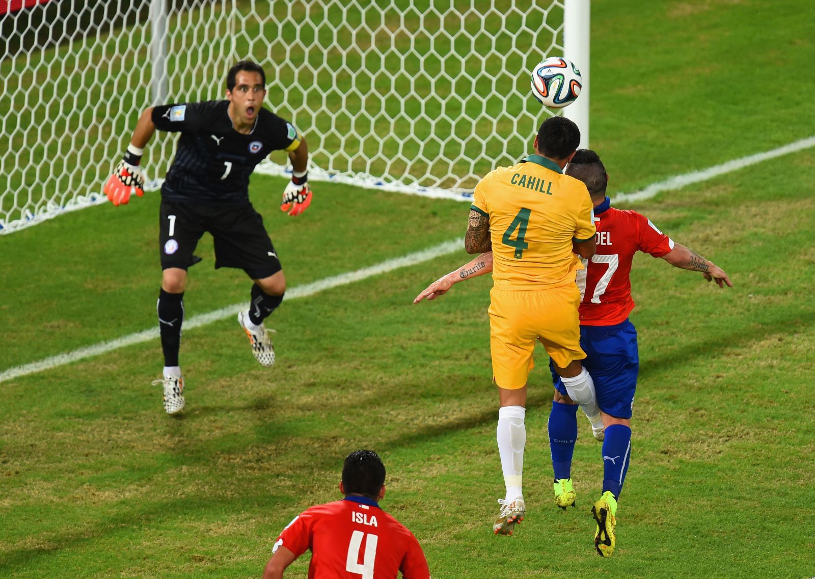 Но гола не было, убаюканные своим превосходством чилийцы начали играть небрежно, и, отвоевывая метр за метром, сборная Австралии стала искать свою контригру, а на 35-й минуте один гол отыграла в типично британском стиле. После навеса Леки с правого фланга Тим Кэхилл на втором этаже «перевисел» Меделя и головой вколотил мяч в сетку. Более того, через минуту тот же Кэхилл мог и сравнять счет, но его удар с угла вратарской ногой отразил Браво.