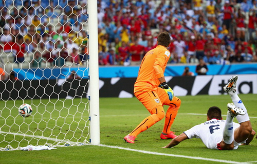Уже перед самым перерывом уругвайцы могли удвоить счет, Форлан пробил с линии штрафной, рикошетом мяч пошел под перекладину - Навас был начеку.