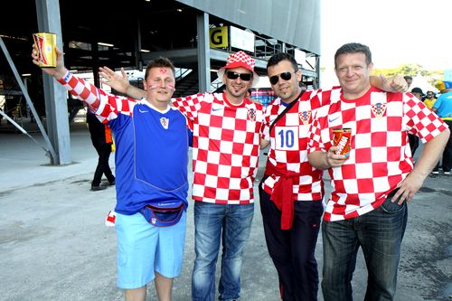 До матчу хорватські фанати, багато з яких були у традиційних ватерпольних шапочках, спокійно попивали пиво, сидячи під парканцем, що обмежував територію стадіону, а бразильці все кудись поспішали – напевне, побачити Дженніфер Лопес. Фотографувалися разом залюбки і з обопільною ініціативою. З вболівальниками охоче сфотографувався і виконавчий директор Федерації футболу України Максим Бондарєв, якого я зустрів перед грою. Пан Бондарєв брав участь у 64-му Конгресі ФІФА, і, я навіть припустив, що ми із ним могли бути єдиними представниками України на матчі-відкритті, принаймні акредитованими. Однак після гри перетнувся із творчим дуетом з телеканалу «Футбол» і зрозумів, що українців було більше. Може, ще хто був, зголосіться.