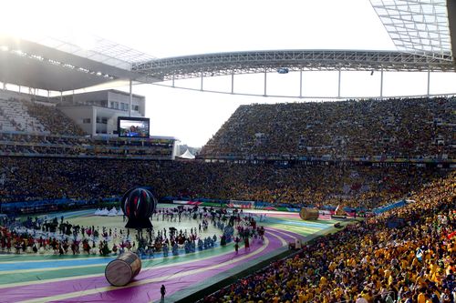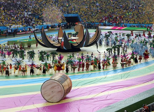 Відкриття чемпіонату було коротеньким (25 хвилин) і основне в ньому було те, що пісню чемпіонату «We are One» проспівали Пітбуль, Дженніфер Лопес, а також місцева зірка Клаудія Лейте. Джей-ло традиційно покрутила своїми всесвітньовідомими стегенцями, показала сексуальний костюм і хорошу форму під час присідань на сцені, тож публіка шаленіла. І ще, як на мене, доволі симпатично футбольний м’яч розпустився у центрі поля, наче квітка: символізуючи три основні цінності Бразилії – природу, людей і футбол. До речі, цей світловий м’ячик складався із 90 тисяч ілюмінаційних кластерів. Як для відкриття футбольного мундіалю - непогано.