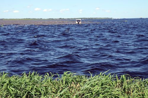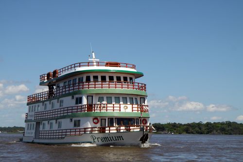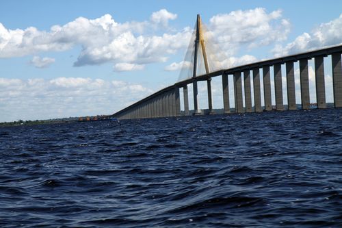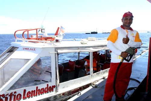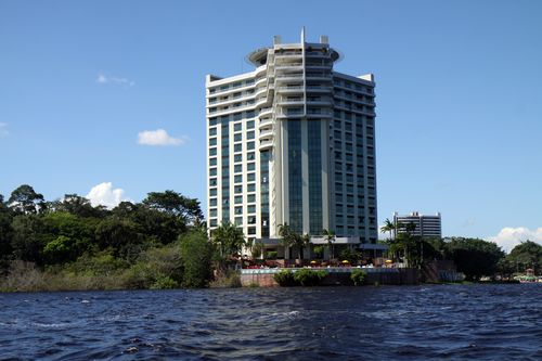 Невеликий, але швидкісний човник жорстко бив дном по воді Ріу-Негру, чия глибина у бухті Манауса сягає 90 метрів! Відтак вантажні судна пришвартовані до берега, а нафтові трейлери спокійно стоять тут на рейді у великій кількості. Довжелезний міст у три з половиною кілометри з‘єднує Манаус із селищем Ірандуба на другій стороні затоки. Для того, щоби дістатися від нашого готелю до місця зустрічі двох річок слід подолати 10 кілометрів.