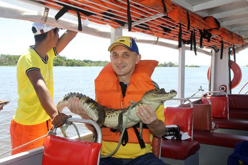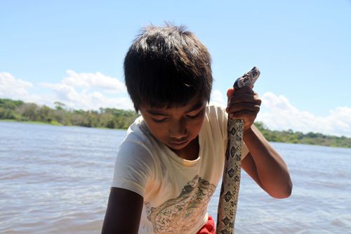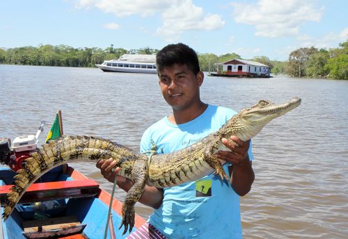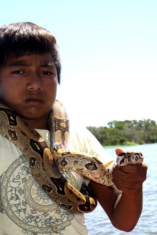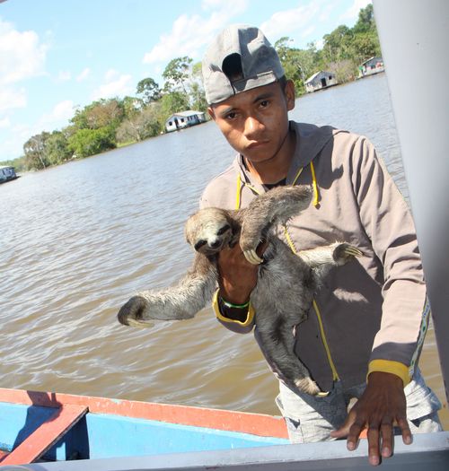 Заробляють аборигени змалку. Коли ми під’їжджали до села, до нас швидко наблизилися два моторних човники, в яких хлопчаки років по 8-10 тримали у руках малих крокодилів, пітона, а трохи старшого підлітка обіймав лінивець. Хочете сфотографуватися, дайте дитині 10 реалів! Мій друг Олег сміливо взяв міні-алігатора до рук, а для мене такої атракції було вже забагато:)