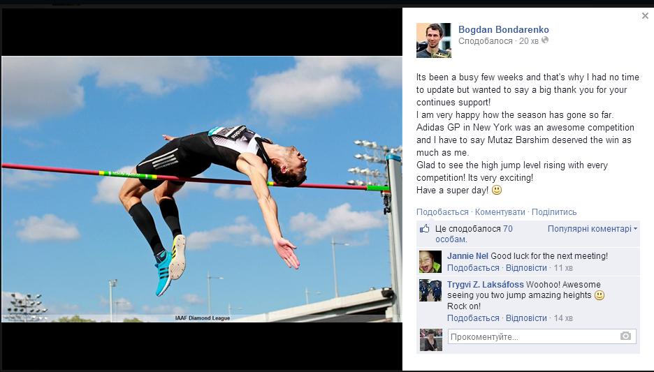 Украинский легкоатлет Богдан Бондаренко, который выиграл этап соревнований Бриллиантовой лиги в Нью-Йорке, поблагодарил болельщиков за поддержку на своей странице в Facebook.