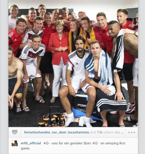 После феерической победы сборной Германии над командой Португалии в стартовом матче группового этапа ЧМ-2014 в раздевалку команды Лева заходила канцлер Германии Ангела Меркель. Поздравляла. О чем посмешил сообщить общественности полузащитник немцев Месут Озил через свою страничку в Instagram: