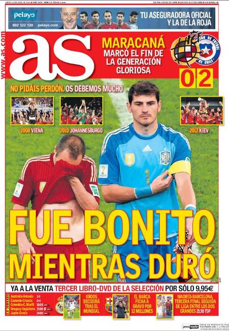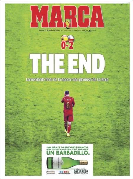 Marca сегодня вышла с огромным заголовком на всю первую страницу: «THE END». А для тех, кто не любит английского, корреспондент издания Дельфин Мелеро разъясняет в материале «Разбившиеся»: «Чемпион мира не протянул в Бразилии и недели. Всего через шесть дней Испания покинула мундиаль и тем самым написала трагический конец великолепного цикла. Из рая – в ад. Игра с Чили лишь подтвердила впечатления после Голландии. Варгас и Арангис наказали нас за непростительные ошибки. Хорошо было, пока длилась светлая полоса – но всё хорошее когда-нибудь кончается. И это закончилось (...) Самый славный цикл в испанской футбольной истории умер в храме «Мараканы». Мы мечтали здесь сыграть в финале, а нас выкинули с черного хода мундиаля. Испания не заслужила такого конца, но это чертов футбол». Дальше там ещё шесть абзацев литературного страдания, с периодическими мощными метафорами вроде: «Испания была словно флан, простоявший всю ночь». Флан – это испанское кушанье, десерт из взбитых яиц, молока и сахара. Естественно, скоропортящийся... Рядом приведены и оценки футболистов по версии Marca. Никто из игроков дель Боске не получил выше пятёрки по 10-балльной шкале, а самыми большими неудачниками (3,5) были признаны сразу четверо: Мартинес, Рамос, Аспиликуэта и Бускетс.