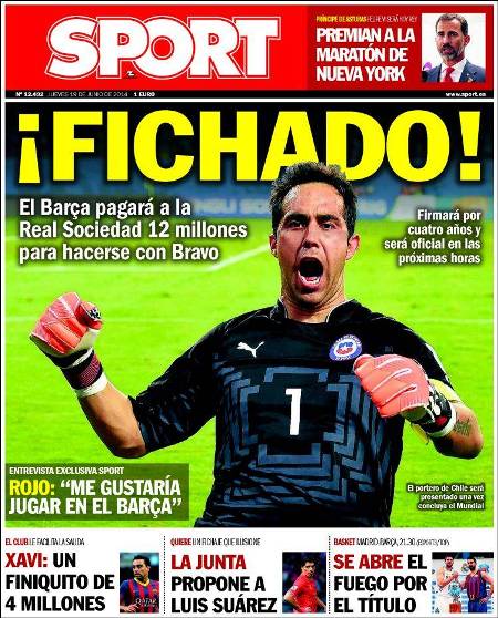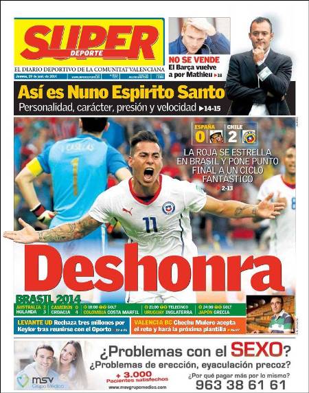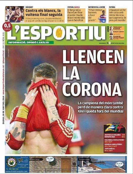 «Исторический нокаут Испании», - резюмирует Sport. Хосе Мария Касановас грустно шутит в своем материале: «Настоящее фиаско. В тот самый день, когда Хуан Карлос отрекся от престола в пользу Филиппа VI, наша сборная отреклась от своего титула чемпиона мира. Вся разница в том, что король сделал это добровольно, а вот сборную сбросили с трона два поражения подряд». Очень уместно на первую полосу вынесли вратаря сборной Чили Клаудио Браво – вышиб «фурию» с мундиаля и тут же в «Барселону» перешёл!