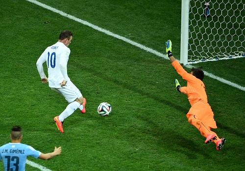 Англичане начали встречу чуть активнее, именно на их счету первый по-настоящему опасный момент. На 9-й минуте Руни классно пробил со штрафного метров с 25-ти, мяч совсем чуть-чуть разминулся с дальним углом ворот Муслеры. Уругвай ответил на 15-й минуте – Кристиан Родригес мощно выстрелил над перекладиной из пределов штрафной.