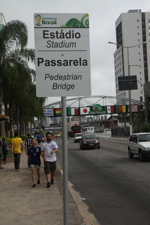 Для того, щоби дістатися арени «Дас Дунас» у Наталі, необхідно перейти через наземний місток. Взагалі, у Бразилії більшість переходів через автобани у межах міста, саме наземні, підземних поки не зустрічав. Так-от, місток португальською звучить точно так, як знаменитий аргентинський футболіст – «Пассарела». Тільки у Даніеля і дві «s», і дві «l», а тут лише присутнє перше подвоєння, але асоціативному мисленню це не заважає. Мости у Наталі гарно прикрашені прапорами країн-учасниць мундіалю і написом «Bem Vindo» (Ласкаво просимо).