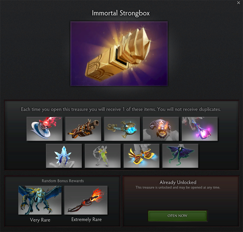 Один из пользователей, правильно указавших победителя турнира, получит приз - сундук Immortal Strongbox, содержащий один из девяти основных предметов качества Immortal, а также два дополнительных редких элемента экипировки такого же качества.