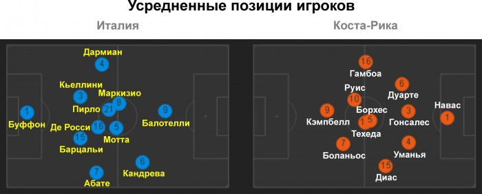 Очевидно что-то пошло не так. Направленные в центр атаки Италии постоянно упирались в наиболее сильную линию тройки центральных защитников Коста-Рики. Это стало причиной низкой результативности передач креативных игроков центра. За игру они выполнили лишь 3 ключевых паса, причем Пирло – лишь один. Для сравнения центральные полузащитники Коста-Рики выполнили за игру 6 ключевых передач, приведших к острым моментам.