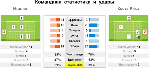 Агрессивность Коста-Рики в обороне выразилась в том, что соотношение числа отборов команд по итогам встречи составило 14 – 24. Сразу следует отметить, что это не явилось следствием превосходства Италии во владении мячом (57%-43%) – мячом итальянцы очень часто владели просто на своей половине поля и в центре, и именно здесь были совершены многие из отборов Коста-Рики.