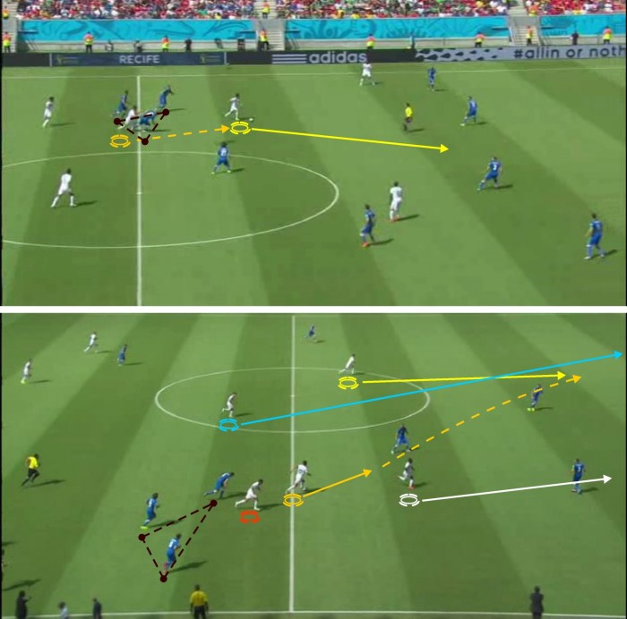 Большинство атак Италии развивались через центр. Это не стало проблемой для Коста-Рики, скорее наоборот. Де Росси (желтый) выполняет передачу через центр, Пирло (белый) играет в касание. Балотелли (красный) в окружении защитников соперника.