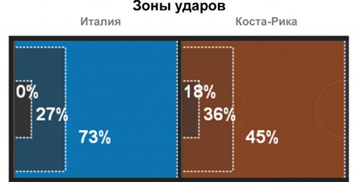 Ограниченная фланговая игра защитников Италии (ее хавбеки принципиально не углублялись высоко в край поля) не позволяла использовать наиболее уязвимое пространство в схеме 5-4-1 – стык между крайними центральными защитниками и латералями. Поэтому в таких условиях наиболее действенным решением для Балотелли и Кассано являлся быстрый удар по воротам издали – при 3 попытках в створ оба нападающих попали в створ лишь по одному разу. Не принесли успеха и верховые передачи в адрес нападающих Италии – Балотелли, Кандрева, а затем и Кассано с Инсинье за все время нахождения на поле не выиграли у защитников Коста-Рики ни одной верховой дуэли. Так же впечатлила и слаженность (см. первую диаграмму) игры защиты Коста-Рики с нападающими соперника в оффсайд – 11 раз итальянцы попадали в эту ловушку.
