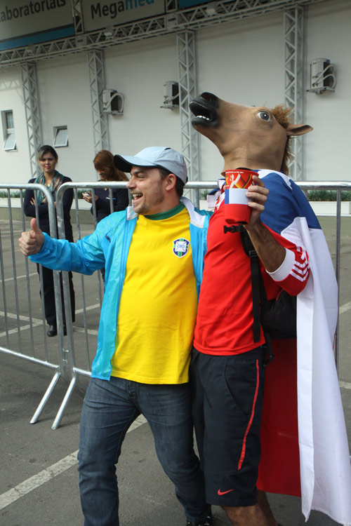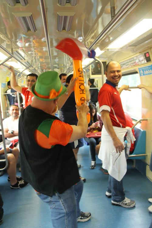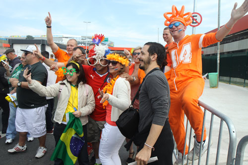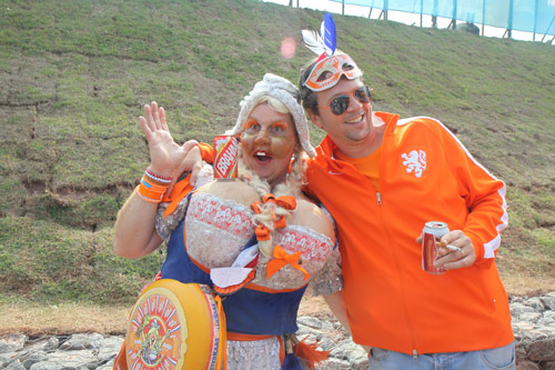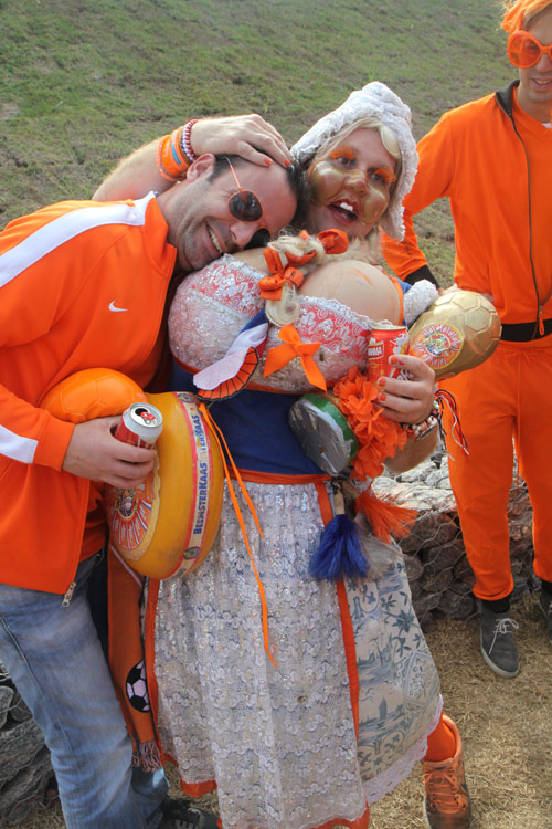 Перед матчем Нідерланди – Чилі голландські фани почали жартівливо лякати опонентів, замахуючись на них надувними молотами. Однак це було справді весело і без жодної агресії. Голландці, традиційно для себе, виявляють дива оригінальності у презентації своєї нації. Один чоловік сконструював у себе на голові цілу композицію із характерних голландських мотивів: сиру, тюльпанів, вітряків, ляльок у національному одязі і дерев‘яних черевичках. Інша компанія весело заводила «Ла-ла-ла-ла-ла-ла», адже це відома європейська вболівальницька співанка. А побачивши журналіста з України, згадали і про Путіна, майже як наші фани!