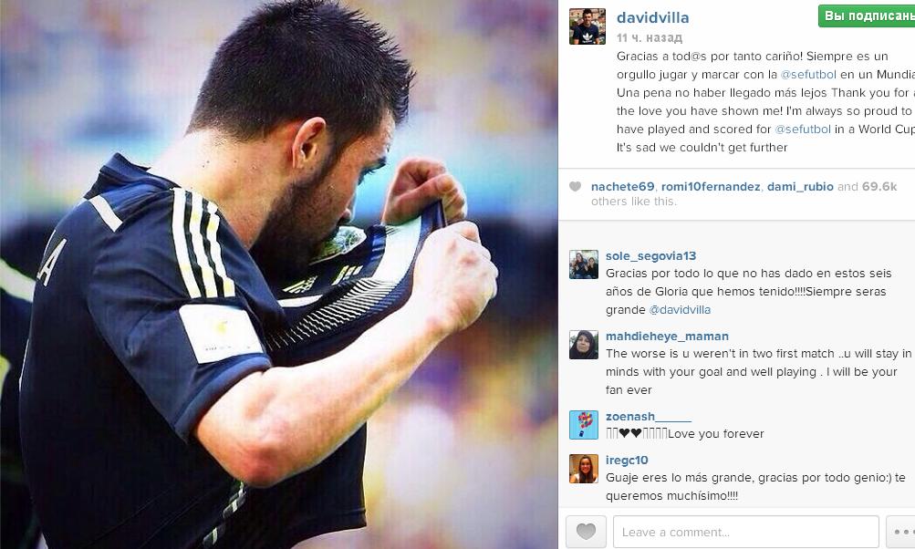 «Спасибо всем вам за любовь, которую вы мне дарили. Я всегда буду горд, что играл и забивал за национальную сборную на Кубке мира. Грустно, что мы не смогли пройти дальше», - написал позже Вилья на своей странице в Instagram.