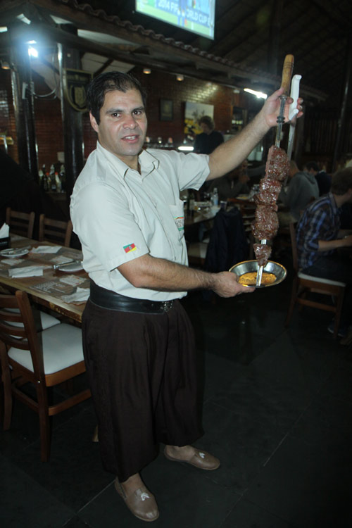 Побачити все це мені пощастило у «Galpao Criolo» - традиційній бразильській «Шураскарії», але у стилі «гаушу» на території етнічного парку «Harmonia». Про те, що таке «шураско» - спечені на вугіллі різноманітні види м’яса, я вам уже розповідав. А тепер покажу , оскільки ця «шураскарія» - дуже оригінальна й особлива. Всі офіціанти, які безперестанку підносять м'ясо на довжелезних шампурах, одягнуті у згадані вище штани, у деяких є червоні галстуки.