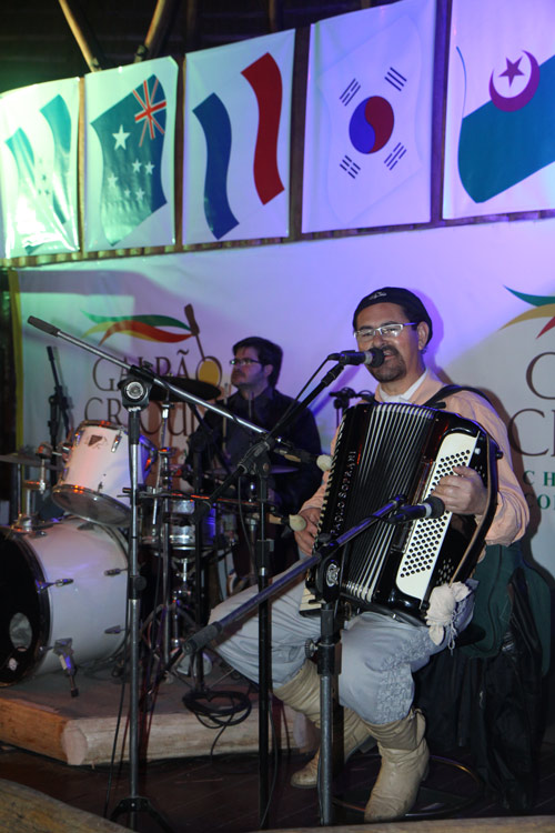 А головною подією вечору у «Шураскарії» був виступ знаного у Порту-Алегрі ансамблю «Raizes de Sul America» («Зірки Південної Америки»). Троє чоловічків і троє жінок виконували традиційні танці «Гаушу», а потім за справу взялися мужчини, котрі видавали дива майстерності каблуками своїх чобіт зі шпорами! Апогеєм став виступ лідера колективу – Едсона Сілви, котрий виплітав такі візерунки мотузками з зовсім не бутафорними металевими кулями, що дух захоплювало. Спочатку Едсон «зачесав» себе цими кулями, здіймаючи чуба і не чіпаючи черепа :) А потім викликав із залу по одному представнику з уболівальницьких груп Нігерії та Аргентини, і, з зав‘язаними (!) очима зробив зачіску кожному із фанів. А на завершення – передав привіт Україні. Краще, ніж розповідати, показати! Отож дивіться!