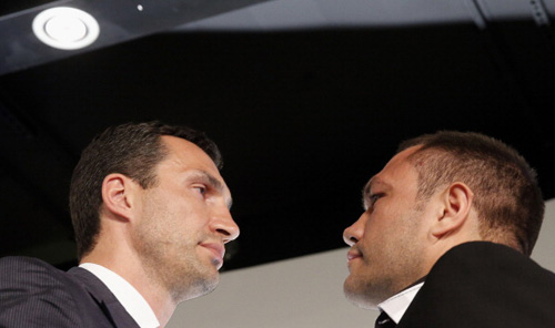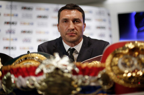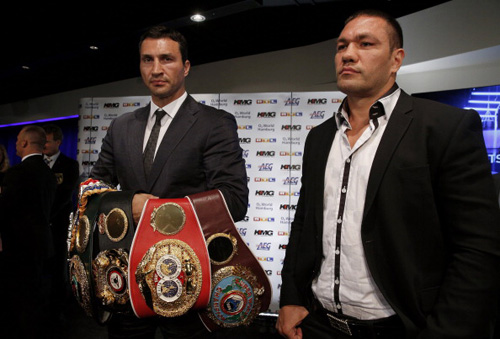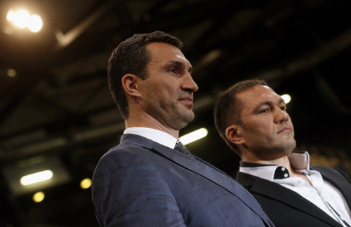 Чемпион мира по версиям IBF, WBA, WBO и IBO в супертяжелом весе украинец Владимир Кличко и его будущий соперник болгарин Кубрат Пулев на арене в Гамбурге, где 6 сентября состоится их бой: